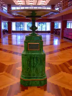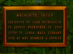 "La Tazza", una de las piezas más grandes de malaquita en América del Norte, se destaca como el punto focal en el centro de la sala de lectura principal, que cuenta con suelos de madera, paneles y estantes de roble, y ventanas grandes que dan al jardín sur.