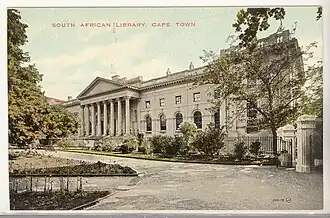 En 1818, Lord Charles Somerset, el primer gobernador civil de la Colonia del Cabo, emitió una proclamación para controlar el comercio del vino, imponiendo un impuesto sobre el vino llevado a Ciudad del Cabo para la venta. Los ingresos netos se utilizarían para formar una Biblioteca Pública que debería "sentar las bases de un sistema, que colocará los medios de conocimiento al alcance de los jóvenes de este remoto rincón del Globo" (suponiendo que un globo tenga esquinas)" y poner a su alcance lo que el más elocuente de los escritores antiguos ha considerado como una de las primeras bendiciones de la vida, la 'Educación en el hogar' ".[1] Desde entonces, el desarrollo de la biblioteca de Sudáfrica fue bifurcado, aunque la biblioteca en Ciudad del Cabo fue el establecimiento original. El modelo más probable para la "Biblioteca Pública" de Ciudad del Cabo fue la Institución de Londres (establecida en 1805 al estilo de un Ateneo).