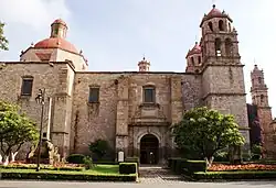 El inmueble presenta el estilo barroco tablerado del siglo XVII, está edificado en cantera rosada y posee planta de cruz latina. En su exterior la fachada principal está orientada al este, y está conformada por un acceso con arco de medio punto que es alternado por pilastras estriadas con capitel dórico, mientras que en su segundo nivel exhibe una ventana colar con arco de medio punto donde se halla la escultura de un pelícano rasgando su pecho, el cual tiene un significado iconográfico que hace alusión a la muerte redentora de Cristo, ya que se cree que esa ave se rasga (sacrifica) para alimentar a sus crías.