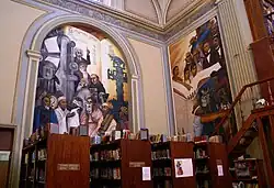 - Mural “El conquistador” pintado por Hollis Howard Holbrook en 1952, se ubica en el muro sur del sotocoro. Realizado en la técnica de pintura al fresco, mide 2.0 x 3.0 m.