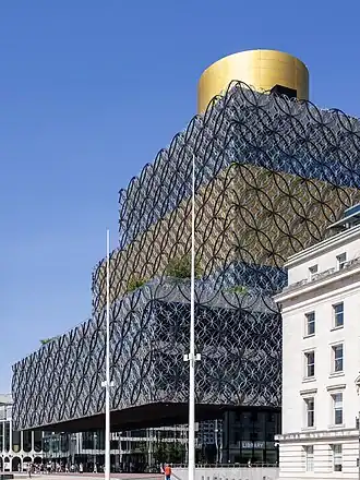 La Biblioteca de Birmingham es una biblioteca pública en Birmingham, Inglaterra. Está situada en la plaza Centenario, en el lado oeste del centro de la ciudad, junto al Birmingham Rep (a la que se conecta, y con la que comparte algunas instalaciones) y la Casa Baskerville. Se inauguró el 3 de septiembre de 2013, reemplazando así a la Biblioteca central de Birmingham. La biblioteca, la cual se estima ha costado 188.8 millones de libras ,[1] es vista por el Ayuntamiento de Birmingham cómo un proyecto emblemático para el plan de desarrollo de la ciudad. Además, es descrita como la biblioteca pública más grande en el Reino Unido, como el espacio público cultural más extenso en Europa,[2][3][4] y la biblioteca regional más grande en dicho continente.[5] 2.414.860 millones de visitantes concurrieron a la biblioteca en el año 2014, posicionándola en el décimo lugar de las atracciones turísticas más populares en el Reino Unido.