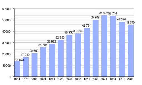 | Gráfica de evolución demográfica de Biella entre 1861 y 2001 |