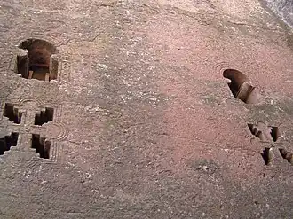 Son visibles diversos tipos de ventana, entre ellos tragaluces en forma de cruz griega, tres en la nave norte y dos en la nave sur. Sobre esas ventanas se percibe una abertura semicircular de estilo Aksum