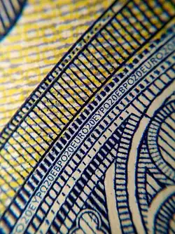 - Microtexto: Algunas zonas del billete muestran una serie de caracteres de tamaño reducido que pueden leerse con ayuda de una lupa. Los caracteres no son borrosos, sino nítidos.