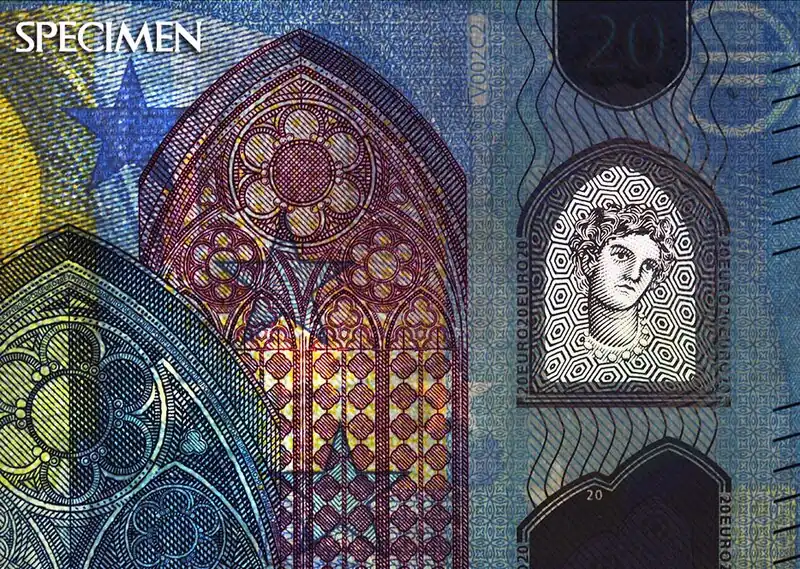 - Ventana con retrato: Al mirar el billete al trasluz, la ventana del holograma se vuelve transparente y muestra un retrato de Europa en ambas caras del billete. Al girar el billete, la ventana del holograma muestra líneas multicolor alrededor de la cifra que indica el valor del billete. En el reverso, dentro de la ventana, aparecen números multicolor que muestran el valor del billete.