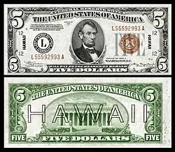 1942: Se emitió la moneda especial de la Segunda Guerra Mundial. HAWAII estaba sobreimpreso en el anverso y el reverso del billete de la Reserva Federal de $ 5; los números de serie y el sello se cambiaron de verde a marrón. Esto se hizo para que la moneda pudiera declararse sin valor si había una invasión japonesa. Un certificado de plata de $ 5 se imprimió con un sello del tesoro amarillo en lugar de azul; estos billetes eran para las tropas estadounidenses en el norte de África. Estos billetes también podrían declararse inútiles si los capturaba el enemigo.