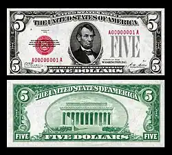 1929: Bajo la Serie de 1928, todos los billetes tamaño pequeño llevaban un diseño estandarizado. Todos los billetes de $ 5 incluían un retrato de Lincoln, el mismo diseño de borde en el anverso y el Lincoln Memorial en el reverso. El billete de $ 5 se emitió como un billete de los Estados Unidos con un sello rojo y números de serie y como un billete de la Reserva Federal con un sello verde y números de serie.