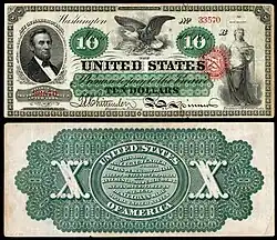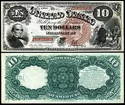 • 1862: La primera $ 10 Estados Unidos Nota se emitió con un diseño de la cara similar a la 1861 Demanda Nota; a la inversa, sin embargo, fue algo revisada.