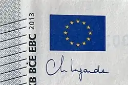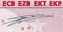 Los billetes deben llevar la firma del presidente del Banco Central Europeo. El diseño inicial fue firmado por Wim Duisenberg, sustituido por Jean-Claude Trichet el 1 de noviembre de 2003, y a su vez reemplazado por Mario Draghi, el 1 de noviembre de 2011. Desde el 1 de noviembre de 2019, Christine Lagarde es la actual presidenta del Banco Central Europeo. Todos los billetes mantienen su validez independientemente de cual sea la firma de las mencionadas que aparezca en ellos.[19][22]