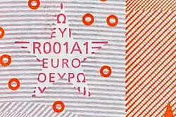 En cada billete de euro hay un código de impresión de seis caracteres que indica al impresor del billete. Estos códigos de impresión tienen una letra inicial, seguida de tres dígitos, luego de una sola letra y terminan en un dígito, por ejemplo, "R001A1".