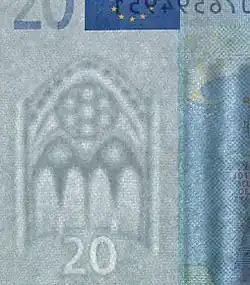 - Marca de agua digital: Igual que la constelación de EURión, una marca de agua digital va incorporada en el diseño de los billetes. Las versiones recientes de varios editores de imágenes, como Adobe Photoshop o Paint Shop Pro, se niegan a trabajar con imágenes de billetes. Este sistema se llama Counterfeit Deterrence System (CDS) y fue desarrollado por el Grupo de Bancos Centrales para la Disuasión de las Falsificaciones.