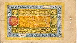 chos srid gnyis ldan gyi rab byung bco lnga bai shog dngul1658 años desde la fundación de la secular forma religiosa de gobierno en el gran país del Tíbet, la tierra de las nieves, el papel moneda del 15.º ciclo (rab byung) del gobierno de la religión y la política (chos srid gnyis ldan), la joya universal de beneficio y bendición, dotada de las cuatro clases de auspicios.Traducción propuesta por el personal del Tibetan Works and Archives de Dharamsala.
