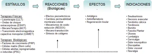 Los estímulos a nivel de membrana, citoesqueleto y a nivel del núcleo celular, con sus diferentes receptores y mediadores, provocan cambios de permeabilidad por repolarización de membrana celular, oxigenación a nivel mitocondrial y transcripción nuclear. Estos cambios en la célula aportan mayor respiración, mayor energía y un aumento de síntesis de proteínas, generando una cascada efectos biológicos común a distintas células, tejidos y patologías, que permite tratar gran parte de las molestias (dolor, movilidad,…) relacionadas con los problemas osteo-musculares (alguno de ellos, como el dolor de espalda, incide a la calidad de vida, en términos de salud, de cerca de 1000 millones de personas a nivel mundial).[1]