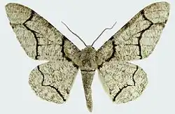 Es una polilla grande con una envergadura de 65 a 95 milímetros (2,6 a 3,7 plg) y de color blanquecina, teñida de ocre, con reflejos irrompibles y estriados color gris ceniza. El ala anterior cuenta con una línea negra antemedial curva, ligeramente angulada en la nervadura media, y con una banda ocre en su interior. Ambas alas cuentan con rastros de una línea medial.[4]: Notas 1 Tienen también una línea negra posmedial muy angulada en la 5ª vena de cada ala, con algunas marcas negras onduladas a cada lado cerca de la vena 4 del ala anterior.[5][6][7]