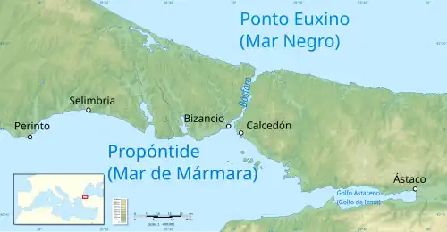 Aunque situada en medio de los bárbaros, Bizancio era considerada griega, por su origen y sus costumbres. Era una de las ciudades helénicas del Helesponto. Su envidiable situación a la entrada del Bósforo, del que era la llave, le confería el papel de almacén del mundo griego, pues era una etapa ineludible para las naves cargadas de trigo del Ponto Euxino.