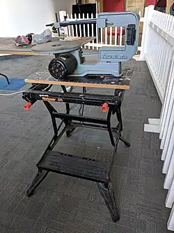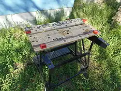 El Black & Decker Workmate es un banco de trabajo portátil de uso general y una herramienta de carpintería general fabricada bajo la marca Black & Decker . Es una mesa plegable para la portabilidad, pero cuando se despliega mide unos 3 pies (1 m) alto. El mostrador está formado por dos mordazas de madera, una de las cuales es fija y la otra móvil sobre varillas roscadas accionadas por asas. Se puede utilizar como banco de carpintero para sujetar piezas de madera, metal y otros materiales, ya sea sujetados entre las mordazas o, utilizando los topes de banco suministrados, sujetada en la parte superior de la mesa. Las mordazas son suficientemente anchas para sujetar la mayoría de herramientas de sobremesa, como una prensa de taladro, una garlopa, una sierra de ingletes, etc.[1]