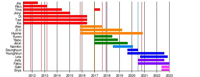 - ↑ «Rania Announces Yumin’s Departure And June Comeback | Soompi». web.archive.org. 15 de diciembre de 2018. Archivado desde el original el 15 de diciembre de 2018. Consultado el 14 de diciembre de 2021.