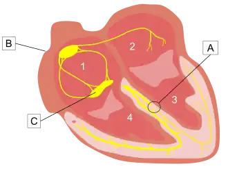 ![]() Esta imagen muestra un bloqueo cardíaco de primer grado, en el que el ritmo cardíaco se ve afectado, pero no detenido. Un bloqueo en el sitio A del ventrículo izquierdo bloquea las señales eléctricas, lo que obliga al corazón a depender del ventrículo derecho para mantener el ritmo correcto. A: Obstrucción B: Nódulo sinusal C: Nódulo auriculoventricular (AV) 1: Aurícula derecha 2: Aurícula izquierda 3: Ventrículo izquierdo 4: Ventrículo derecho | ||