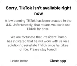 El 18 de enero de 2025, TikTok cerró sus servicios en EE. UU. debido a un proyecto de ley que prohibía la aplicación en todo el país.[80] La aplicación está actualmente eliminada de la App Store de Apple y de Google Play Store para los usuarios de los Estados Unidos, lo que les impide descargar la aplicación en dispositivos móviles. [81] Los usuarios que aún tienen la aplicación instalada reciben un mensaje de error indicando que el servicio ya no está disponible en EE. UU., y los que visitan el sitio web reciben un mensaje similar. Aunque los usuarios pueden descargar los datos de su cuenta e iniciar sesión en el sitio web, todas las funciones sociales, como cargar contenido, ver, comentar o visitar perfiles, están deshabilitadas.[82]