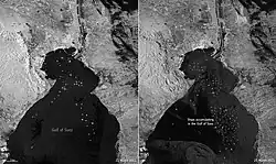![]() El Ever Given visto el 24 de marzo de 2021 por el satélite Sentinel-2 de la Agencia Espacial Europea. | ||