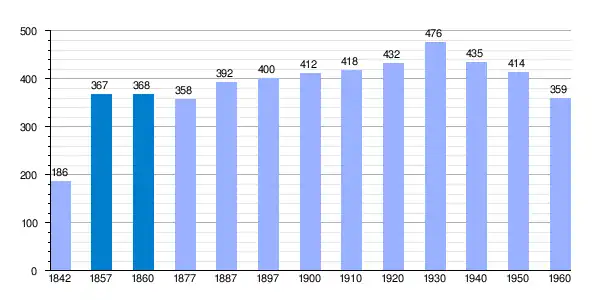 | Gráfica de evolución demográfica de Bocigas de Perales[6] entre 1842 y 1960 |