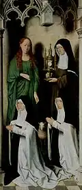 Y, en el panel derecho por el exterior, las donantes arrodilladas en oración Agnes Casembrood y Clara van Hulsen, con las santas de sus nombres: santa Inés (Agnes) y santa Clara.