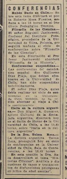 Recorte del Diario La Nación (Santiago de Chile), del 1 de octubre de 1946. Aquí, se anuncia una de las primeras conferencias dedicada a la filosofía de las ciencias en Chile.[40]