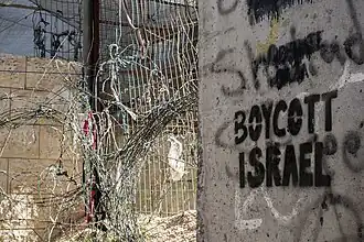 En 2005, más de 170 organizaciones de la sociedad civil palestina lanzaron el movimiento de Boicot, Desinversión y Sanciones (BDS). El objetivo del BDS es someter a Israel al boicot, la desinversión y las sanciones hasta que se retire de los territorios ocupados, elimine la barrera de separación en Cisjordania, garantice la plena igualdad para los ciudadanos árabe-palestinos de Israel y otorgue el derecho al retorno de los palestinos refugiados.[2] El BDS sigue el modelo del movimiento contra el apartheid en Sudáfrica.[30] Sus defensores comparan la difícil situación de los palestinos con la de los sudafricanos negros.[31][32]