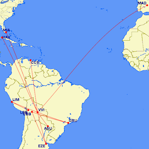 - ↑ «Hoy sale a Madrid vuelo inaugural de aerolínea Boliviana de Aviación». opinion.com.bo. Opinión. 8 de diciembre de 2012. Consultado el 31 de enero de 2016.