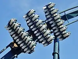 Wing Coaster: nuevo modelo de tren en el que los pasajeros viajan colgados de los laterales de la vía. La distribución de los asientos es de dos personas por cada lado por vagón. Teniendo el tren siete vagones, un total de 28 personas. Este nuevo modelo presenta diferencias del modelo Wing Rider de Intamin (la primera wing coaster fue Furius Baco, de Intamin AG en PortAventura Park). Los asientos disponen de unos arneses parecidos al modelo flying y la estructura del vagón hace forma de V invertida, dejando los asientos por debajo de la vía. A diferencia del modelo de Intamin (asientos situados por encima de la vía), los asientos están situados al nivel de la vía.