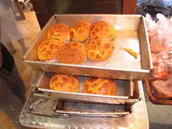 Típicamente el pastel se lleva caliente del horno a la mesa del cliente, y se sirve cortado por la mitad con un gran trozo de mantequilla entre ellas. A veces se critica esta receta por contener demasiada grasa y colesterol.