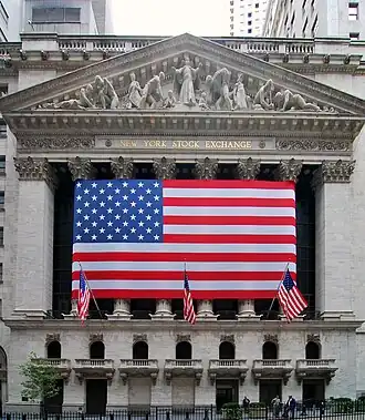 La Bolsa de Nueva York (en inglés: New York Stock Exchange; NYSE) es el mayor mercado de valores del mundo en volumen monetario y el primero en número de empresas adscritas. Su volumen en acciones fue superado por la del NASDAQ[1] durante los años 1990, pero el capital de las compañías listadas en la NYSE es cinco veces mayor que en el NASDAQ. La Bolsa de Nueva York cuenta con un volumen anual de transacciones de 36 billones de dólares, incluidos los 12 billones de compañías no estadounidenses. Fue creada en 1792, cuando un grupo de corredores de bolsa se organizó formando un comité llamado «New York Stock and Exchange Board» (NYS&EB) con la finalidad de poder controlar el flujo de acciones que, en aquellos tiempos, era negociado libremente y principalmente en la acera de Wall Street. En 1918, después de la Primera Guerra Mundial, se convierte en la principal casa de bolsa del mundo, dejando atrás a la Bolsa de Londres. El jueves 24 de octubre de 1929, llamado a partir de entonces el Jueves Negro, se produjo una de las más grandes caídas en esta bolsa, que produciría la recesión económica más importante de Estados Unidos en el siglo XX, la «Gran Depresión».