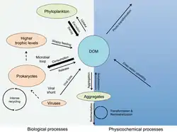 El fitoplancton son organismos autotróficos producen biomasa que forman la base de la cadena alimenticia que soporta a toda la vida en el océano. El fitoplancton convierte compuestos inorgánicos en componentes orgánicos (biomasa). En el diagrama de la derecha, las flechas muestran los varios procesos de producción (flechas que apuntan hacia DOM, materia orgánica disuelta por sus siglas en inglés) y remoción de la materia orgánica disuelta (flechas que apuntan desde DOM hacia afuera). Las flechas punteadas representan los procesos biológicos más importantes a través de los cuales el MOD (materia orgánica disuelta) es transferido. Debido a estos procesos, la proporción de MOD voluble disminuye rápidamente en función de la profundidad, mientras que el MOD insoluble aumenta considerablemente durante su transporte hacia las profundidades del océano.