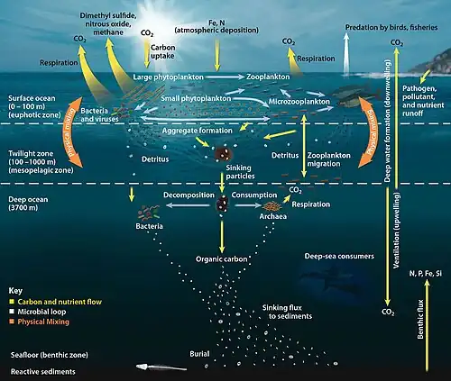 La bomba biológica es responsable de transformar el carbono inorgánico disuelto (CID) en biomasa orgánica y bombearlo en forma particulada o disuelta al océano profundo. Los nutrientes inorgánicos y el dióxido de carbono son fijados durante la fotosíntesis por el fitoplancton, que liberan materia orgánica disuelta (MOD) y son consumidos por el zooplancton herbívoro. El zooplancton más grande, como los copépodos, ingieren gránulos fecales que se pueden volver a ingerir y hundirse o acumularse con otros detritos orgánicos en agregados más grandes que se hunden más rápidamente. MOD es parcialmente consumido por bacterias (puntos negros) y respira; el MOD refractario restante se adveciona y se mezcla en las profundidades marinas. El MOD y los agregados exportados a las aguas profundas se consumen y respiran, devolviendo así el carbono orgánico al enorme depósito oceánico profundo de CID. Aproximadamente el 1% de las partículas que salen de la superficie del océano llegan al lecho marino y se consumen, respiran o se entierran en los sedimentos. Allí, el carbono se almacena durante millones de años. El efecto neto de estos procesos es eliminar el carbono en forma orgánica de la superficie y devolverlo a CID a mayores profundidades, manteniendo el gradiente oceánico de superficie a profundo de CID. La circulación termohalina devuelve el CID de los océanos profundos a la atmósfera en escalas de tiempo milenarias.[9]