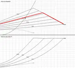 En el primer caso el punto de trabajo encontrado para la instalación es el representado en la gráfica, la bomba trabajará sobre la línea inclinada marcada en rojo. A carga parcial, a medida que se van cerrando las válvulas automáticas de dos vías de la instalación, se necesita menos caudal y teóricamente menos altura manométrica. Teniendo en cuenta que el consumo de la bomba depende del producto caudal por altura manométrica, al disminuir ambos factores se reduce sensiblemente aquel, como puede apreciarse en las curvas de potencia absorbida del cuadro inferior.[7]