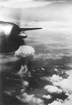 Los Estados Unidos, con la ayuda del Reino Unido y Canadá en sus respectivos proyectos secretos «Tube Alloys» y «Chalk River Laboratories»,[20]​ diseñaron y fabricaron las primeras bombas atómicas bajo lo que fue llamado «Proyecto Manhattan». La investigación científica fue dirigida por el físico estadounidense Robert Oppenheimer. La bomba atómica fue probada el 16 de julio de 1945,[21]​ cerca de Alamogordo, Nuevo México, en lo que se conoció como «Prueba Trinity». La bomba utilizada en la prueba, llamada «gadget», causó una explosión cercana a la que ocasionarían 20 000 toneladas de TNT, mucho mayor de la esperada.[22]