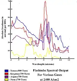 El espectro de salida de una lámpara de destellos es principalmente un producto de su densidad de corriente.[11] Después de determinar la "energía de explosión" para la duración del pulso, (la cantidad de energía que destruirá él en uno a diez centellea), y de escoger un nivel de energía seguro para la operación, el equilibrio de voltaje y capacitancia puede ser ajustado para centrar la salida en cualquier lugar desde el infrarrojo cercano hasta el lejano ultravioleta. Las densidades de corriente bajas resultan del uso de un muy alto voltaje y corriente baja.[14] Esto produce líneas espectrales ampliadas con la salida centrada en el infrarrojo cercano, y es mejor para bombear láseres infrarrojos tales como los de Nd-YAG y erbio-YAG. Las densidades de corriente más altas amplían las líneas espectrales al punto donde empiezan a mezclarse, y se produce una emisión continua. Las longitudes de onda más largas alcanzan niveles de saturación a densidades de corriente más bajas que las longitudes de onda más cortas, de tal forma que a medida que aumenta la corriente el centro de salida se moverá hacia el espectro visible, lo cual es mejor para bombear láseres de luz visible, como los de rubí.[2] En este punto, el gas se convierte casi en un "radiador de cuerpo gris" (greybody radiator) ideal. Incluso las densidades de corriente más altas producirán radiación de cuerpo negro (blackbody radiation) centrando la salida en el ultravioleta.