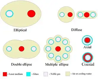 En la configuración más común, el medio activo es en la forma de una varilla localizada en un foco de una cavidad reflejada, que consiste de una sección transversal elíptica perpendicular al eje de la varilla. La lámpara de destellos es un tubo localizado en el otro foco de la elipse. A menudo el recubrimiento del espejo se escoge para que refleje las longitudes de onda que son más cortas que la salida láser mientras absorbe o transmite longitudes de onda que son iguales o más largas para minimizar la lente térmica. En otros casos, se usa un absorbente para las longitudes de ondas más largas. A menudo, la lámpara está rodeada por una chaqueta cilíndrica llamada tubo de flujo (flow tube). Este tubo de flujo es normalmente hecho de un vidrio que absorberá las longitudes de onda inadecuadas, como ultravioletas, o proporcionará un camino para agua de enfriamiento la cual absorbe infrarrojos. A menudo, a la chaqueta se le da un recubrimiento dieléctrico que refleja longitudes de onda inadecuadas de regreso a la lámpara. Esta luz es absorbida y algo de ella es reemitida en longitudes de onda adecuadas. El tubo de flujo también sirve para proteger la varilla en el caso de una falla violenta de la lámpara.