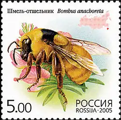 ![]() Bombus anachoreta en estampilla rusa. El cuerpo posterior está más claramente rayado que el que se muestra en la imagen. | ||