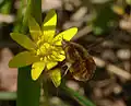 Bombylius major sobre una flor de una celidonia menor (Ficaria verna)
