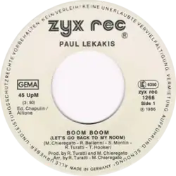 «Boom Boom (Let's Go Back to My Room)» es el sencillo debut por el músico Paul Lekakis. Publicado en 1987 a través de ZYX Records, y más tarde por Polydor Records para un lanzamiento mundial,[nota 1] la canción alcanzó el puesto #43 en el Billboard Hot 100, el #6 en el Billboard Dance Club Songs y el #60 en el UK Singles Chart. El sencillo obtuvo un éxito mayor en otras partes del mundo, alcanzando el puesto #1 por 5 semanas en el Australian Music Report y por 3 semanas en el Springbok Radio.