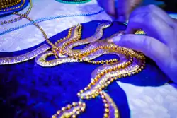 - Aplicación de perlas: Utilizada para resaltar los contornos y detalles específicos en los trajes, proporcionando un acabado elegante y decorativo.