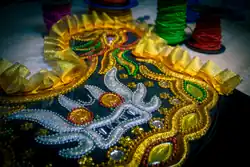 - Aplicación de lentejuelas y canutillos: Las lentejuelas metálicas o plásticas y los canutillos se aplican para decorar los bordes de las ramas, flores y otros diseños, añadiendo textura y brillo.