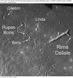 Al noroeste aparece la cresta Rupes Boris, una pequeña escarpadura de 6 km de longitud. También al noroeste de Boris se localiza Gaston y casi al noreste Linda.