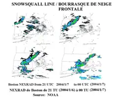 Una borrasca frontal de nieve es una línea convectiva frontal intensa (similar a una línea de turbonada), cuando la temperatura está cerca del punto de congelación en la superficie. La fuerte convección que se desarrolla tiene suficiente humedad para producir ventiscas en los lugares por donde pasa si el viento provoca intensas nevadas.[3] Este tipo de tormenta de nieve generalmente dura menos de 30 minutos en cualquier punto de su trayectoria, pero el movimiento de la línea puede cubrir grandes distancias. Las ráfagas frontales pueden formarse a corta distancia por delante del frente frío de superficie, o por detrás en situaciones en las que hay otros factores contribuyentes, como el levantamiento dinámico de un sistema de baja presión cada vez más profundo o una serie de líneas de depresión actuando de manera similar a un frente frío tradicional. En situaciones donde las turbonadas se desarrollan posfrontalmente, no es inusual que dos o tres bandas lineales de turbonadas pasen seguidas, separadas por solo 40,2 kilómetros (25 mi) y cada uno pasa por el mismo punto con aproximadamente 30 minutos de diferencia.