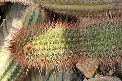 Presentan de 8 a 20 costillas bajas y redondeadas, que se dividen en tubérculos mediante surcos. En ellos se sitúan las areolas, las cuales están muy próximas entre sí. Tienen de 25 a 60 espinas de color amarillo dorado en forma de agujas o erizadas y miden de 1 a 1,5 cm de largo.