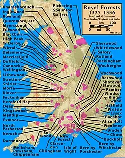 - ↑ Young, Charles R. (1979). The royal forests of medieval England. [Philadelphia]: University of Pennsylvania Press. ISBN 0-8122-7760-0. 0812277600.