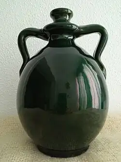La botija de dos asas es un recipiente de arcano diseño alfarero definido en los repertorios cerámicos como vasija de barro, por lo general de tamaño mediano, cuerpo esférico y de cuello estrecho y breve.[2][a] Su morfología y usos –especialmente relacionados con la alfarería de agua–, documentados en casi todas las guías y obras básicas sobre cacharrería popular o alfarería de basto,[3][4] presentan una diversidad iconográfica sujeta a cierta unidad tipológica: vasijas globulares, panzudas, de cuello pequeño pero grueso del que parten dos asas estilizadas que tras abrir un ángulo más o menos pronunciado se apoyan en los hombros de la pieza.[4][5]