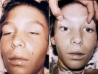 Joven de 14 años con botulismo. Nótese la oftalmoplejia bilateral total con ptosis del párpado en la imagen de la izquierda, y las pupilas dilatadas y fijas en la imagen de la derecha. El muchacho estaba completamente consciente. | ||