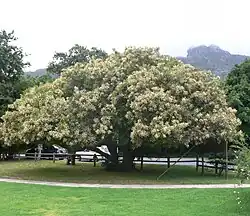 Es un árbol de hoja perenne. Crece hasta unos 15 metros de altura, pero tiene grandes ramas extendidas y un hábito en expansión. La corteza es lisa de color marrón grisáceo moteado y atractivo. Las hojas verdes, coriáceas son dentadas y lanceoladas, aparecen en rosetas de seis, a intervalos a lo largo de los tallos, e irradian hacia fuera de la rama como una estrella. Las hojas jóvenes son suaves, aterciopelados y doradas. Las pequeñas flores son blancas y perfumadas, aparecen en verano, en racimos densos.